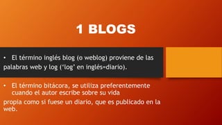 Un blog es un sitio web que permite a uno o más autores publicar artículos de manera regular. Los blogs se pueden categorizar como personales, corporativos o comerciales. Existen varias herramientas para crear y gestionar blogs, como WordPress, Blogger y Joomla. También hay herramientas para mejorar blogs existentes, como plugins y widgets. Los microblogs como Twitter permiten publicar mensajes breves, mientras que otras plataformas como Tumblr y Posterous ofrecen funciones adicionales como fotos e videos.