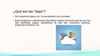 Este documento describe varias aplicaciones educativas de Google como Gmail, Calendar, Docs, Sites, Groups y Video que pueden usarse en el aula. Estas herramientas permiten comunicación y colaboración en línea entre estudiantes y profesores mediante correo electrónico, agenda compartida, edición de documentos en la nube, creación de sitios web y videos, y organización de grupos. El documento concluye que el uso de dispositivos móviles y estas aplicaciones puede modernizar la enseñanza y facilitar un aprendizaje más significativo para los