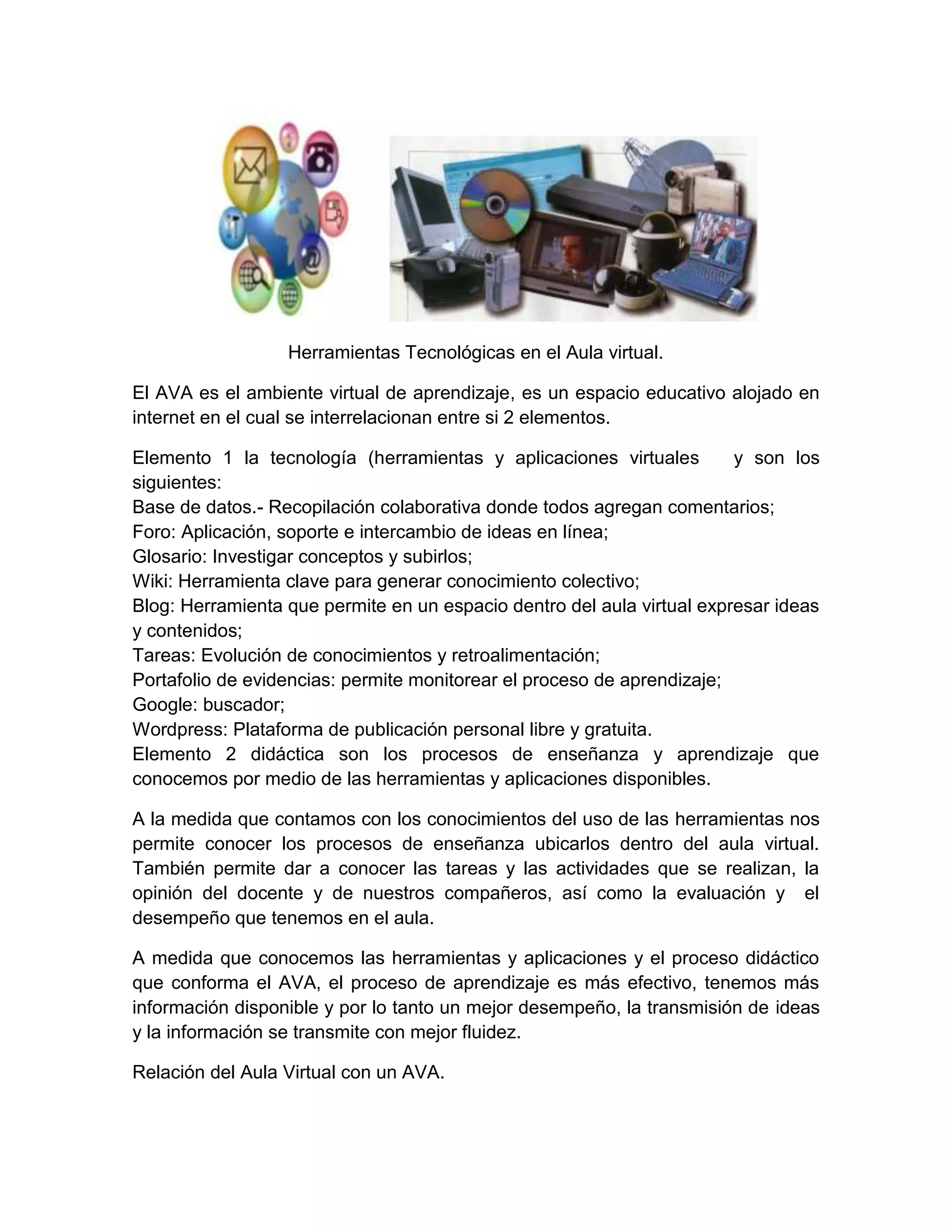 El documento describe las herramientas tecnológicas utilizadas en un Aula Virtual y cómo se relacionan con el Ambiente Virtual de Aprendizaje (AVA). Explica que el AVA contiene dos elementos principales: las herramientas tecnológicas como bases de datos, foros, wikis y blogs, y los procesos de enseñanza y aprendizaje. También describe que el aula virtual es parte del AVA más amplio y ambos utilizan herramientas tecnológicas y procesos educativos para facilitar el aprendiz