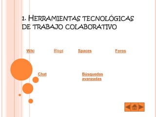 Este documento describe diferentes herramientas tecnológicas de trabajo colaborativo como wikis, blogs, espacios, foros y chat. Explica brevemente qué son, para qué se usan, ventajas y desventajas de cada una y cómo se crean. También incluye ejemplos de cada herramienta.