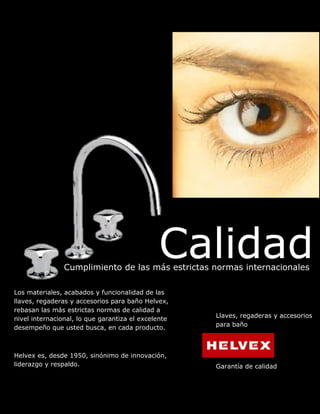 El documento describe que los productos para baño de Helvex, como llaves, regaderas y accesorios, cumplen con estrictas normas internacionales de calidad para garantizar un excelente desempeño. Helvex ha sido sinónimo de innovación, liderazgo y respaldo desde 1950.