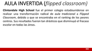 El documento describe cómo la escuela secundaria Clintondale High School en Estados Unidos fue la primera en cambiar de un modelo de aula tradicional a un modelo de aula invertida o flipped classroom. Este cambio resultó en una drástica reducción del fracaso escolar en todas las materias. El documento también proporciona información sobre el programa gratuito Tube Catcher, el cual permite descargar y convertir videos de YouTube y otros sitios web a diferentes formatos como AVI, así como grabar pantalla y voz. El programa es multiidioma e incluye un sistema de donaciones vol