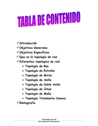 Este documento describe las diferentes topologías de red, incluyendo bus, estrella, mixta, anillo, doble anillo, árbol, malla y totalmente conectada. Explica las ventajas y desventajas de cada topología, así como sus características principales. La topología de red se refiere a la forma en que los nodos de una red están interconectados y cómo fluyen los datos entre ellos.
