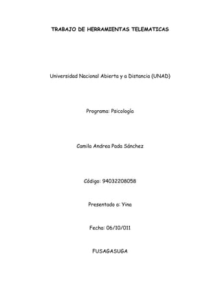 Este documento describe las actividades realizadas en el curso de herramientas telemáticas de la Universidad Nacional Abierta y a Distancia. Incluye explorar los servicios de Gmail como carpetas y configuración de cuenta, y servicios adicionales de Google como Calendar, Docs y Translate. También define términos como Web 2.0, redes sociales, dirección IP, DNS, e investiga motores de búsqueda como Google, AltaVista y AlltheWeb.