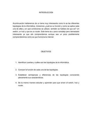 El documento describe diferentes tipologías de redes informáticas, incluyendo topología de árbol, estrella, anillo, malla y bus. Cada topología se define y analizan sus ventajas y desventajas. Por ejemplo, la topología de árbol permite conectar más dispositivos pero requiere mucho cableado, mientras que la topología de estrella es más fácil de configurar pero si falla el nodo central toda la red deja de funcionar. El documento provee esta información para ayudar a entender cómo funcionan diferentes configuraciones