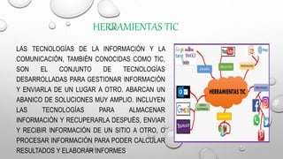 Este documento habla sobre las herramientas TIC (tecnologías de la información y comunicación). Describe las clases de herramientas TIC incluyendo redes, terminales y servicios. También cubre las características y tendencias de las TIC, como el teletrabajo, la ciberseguridad y las redes definidas por software.