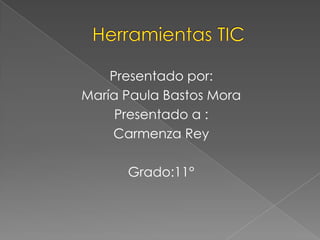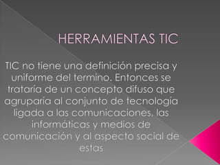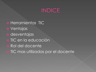 El documento trata sobre el uso de herramientas TIC en la educación, destacando sus ventajas como el acceso a recursos educativos y la personalización del aprendizaje, junto con desventajas como distracciones y dependencia. Se enfatiza el rol del docente en la integración de TIC y la importancia de preparar a los estudiantes para ser consumidores inteligentes de tecnología. Además, menciona diversas herramientas TIC utilizadas por los docentes, como chats, foros, videoconferencias y redes sociales.