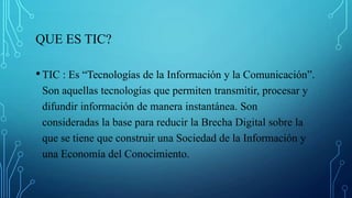 Este documento describe las Tecnologías de la Información y la Comunicación (TIC), incluyendo que permiten transmitir y procesar información de manera instantánea, y como optimizan el manejo de información y comunicación. Explica que sirven para disponer de información inmaterial, comunicarse instantáneamente a distancia, permitir comunicación interactiva, y automatizar tareas. Además, clasifica los tipos de TIC en redes, terminales y servicios, y discute su aplicación a la educación.