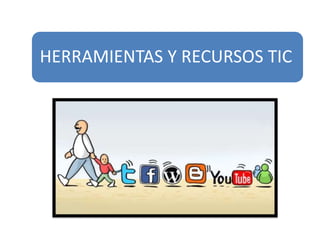 El documento describe diferentes tipos de herramientas y recursos TIC que pueden usarse para apoyar procesos educativos. Incluye recursos para crear materiales didácticos, presentaciones y mapas mentales; herramientas web como blogs, videos y recursos educativos interactivos; medios de comunicación y socialización como correo electrónico, redes sociales y videoconferencia; entretenimiento educativo a través de juegos y videos; y plataformas de aprendizaje en línea y redes sociales educativas.