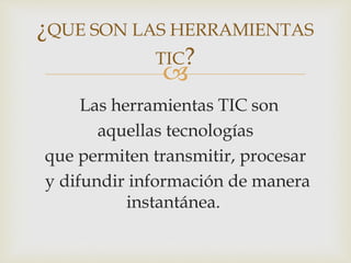 Las herramientas TIC son tecnologías como redes, terminales y servicios que permiten transmitir, procesar y difundir información de manera instantánea. Facilitan el acceso a información en cualquier formato de forma rápida. Algunas herramientas TIC comunes son redes como la telefonía fija, banda ancha y televisión; terminales como ordenadores, teléfonos móviles y televisores; y servicios como correo electrónico, banca en línea, música y comercio electrónico.