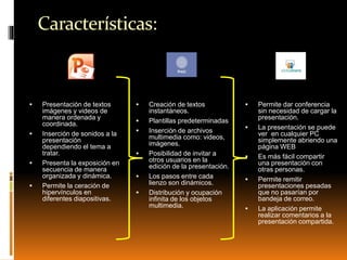 Este documento describe y compara las herramientas PowerPoint, Prezi y Slideshare. Detalla las características y ventajas de cada una para crear y compartir presentaciones, como la inserción de texto, imágenes y video, y la posibilidad de agregar hipervínculos y comentarios. También señala algunas desventajas como la necesidad de conexión a Internet y la posibilidad de pérdida de información por virus. El documento concluye que si bien todas son útiles, PowerPoint es la herramienta más comúnmente usada debido a