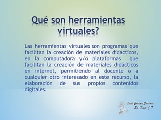 Este documento describe las herramientas virtuales como programas que facilitan la creación de materiales didácticos en línea para docentes y estudiantes. Explica que las herramientas virtuales son ahora una parte importante de los métodos de enseñanza y aprendizaje, permitiendo que los estudiantes accedan a información en internet. Además, las herramientas tecnológicas pueden ayudar a los estudiantes a comprender mejor los temas al involucrarse más con el conocimiento. El papel del profesor es seleccionar las herram