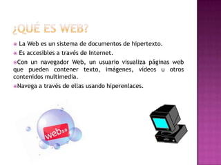 El documento describe la evolución de la web. La Web 1.0 era básicamente de solo lectura, con páginas estáticas y navegadores de texto. La Web 2.0 permite a los usuarios interactuar y colaborar como creadores de contenido a través de comunidades virtuales y herramientas como blogs, wikis, redes sociales y compartir videos y fotos.