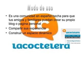 Este documento presenta información sobre la plataforma de blogs La Coctelera. Ofrece instrucciones para registrarse en La Coctelera incluyendo los pasos para proporcionar nombre, apellidos, fecha de nacimiento, localidad, país, correo electrónico, contraseña, nombre de usuario y seleccionar un dominio para el blog.