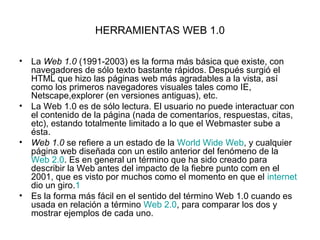 El documento describe las características de las herramientas web 1.0, 2.0 y 3.0. La web 1.0 era de sólo lectura y el usuario no podía interactuar con el contenido. La web 2.0 facilita el compartir información y la colaboración entre usuarios que pueden crear y modificar contenido. La web 3.0 se refiere a la evolución hacia el uso de inteligencia artificial y la web semántica, aunque no hay una definición única acordada.
