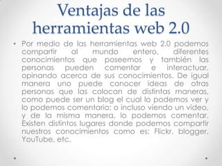 Las herramientas web 2.0 permiten compartir conocimiento a través de medios como imágenes, videos y blogs. Ofrecen la ventaja de que los usuarios pueden compartir sus ideas con el mundo y comentar e interactuar sobre las ideas de los demás. Sin embargo, también presentan desventajas como que el contenido compartido puede ser visto, copiado y distribuido por cualquier persona, y al compartir demasiada información personal se expone la privacidad del usuario.