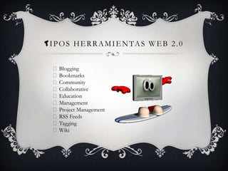 Este documento describe diferentes herramientas web 2.0 como blogs, marcadores, RSS, etiquetado y wikis. Explica que los blogs permiten publicar opiniones y experiencias fácilmente, los marcadores almacenan páginas web útiles, RSS distribuye actualizaciones de sitios web, el etiquetado representa palabras clave visualmente y wikis permiten que usuarios editen y modifiquen páginas web de manera colaborativa.