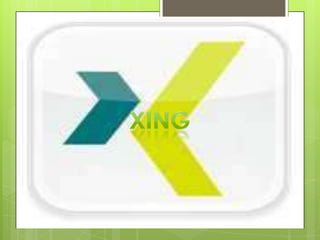 El documento proporciona instrucciones sobre cómo registrarse y usar la herramienta web Xing. Para registrarse, el usuario debe proporcionar un nombre de usuario, dirección de correo electrónico, contraseña y aceptar el contrato de uso. Una vez registrado, el usuario puede cargar fotos, buscar otros usuarios, enviar mensajes y organizar eventos. La función principal de Xing es permitir la comunicación profesional entre usuarios.