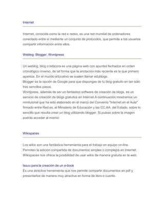 Internet es una red mundial que conecta ordenadores para compartir información. Existen diversas herramientas en línea para crear blogs, como Blogger y WordPress, y wikis como Wikispaces. También hay servicios para compartir presentaciones (SlideShare), videos (YouTube), fotos (Flickr), documentos (Google Docs, Zoho) y convertir entre formatos (Media Convert).