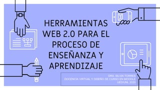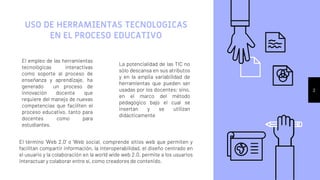 El documento describe algunas herramientas Web 2.0 útiles para el proceso de enseñanza y aprendizaje como mapas mentales, wikis, blogs y Google Docs. Explica que estas herramientas permiten compartir información y colaborar entre usuarios, y cómo pueden usarse didácticamente para actividades como la organización de información, presentaciones interactivas, trabajo colaborativo y la creatividad. Se enfoca en dos herramientas específicas, Mindomo para mapas mentales y blogs, describiendo sus características y cómo pueden ajust
