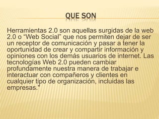 Las herramientas web 2.0 permiten a los usuarios crear y compartir información e ideas en lugar de solo recibir comunicaciones. Estas herramientas pueden mejorar la participación, integración y colaboración entre grupos y organizaciones. Se caracterizan por ser interactivas y dinámicas, permitiendo una mayor participación de los usuarios a través de blogs, wikis, redes sociales y otras plataformas.