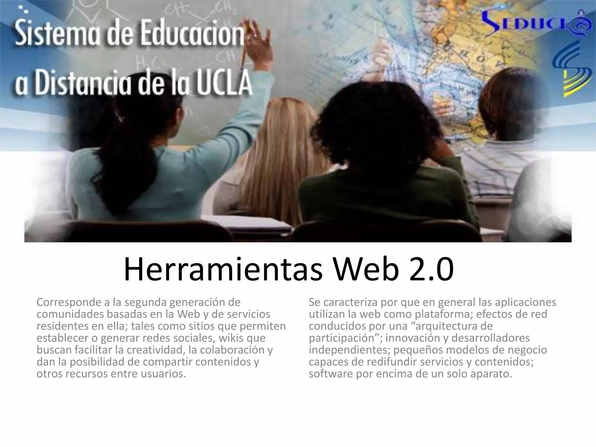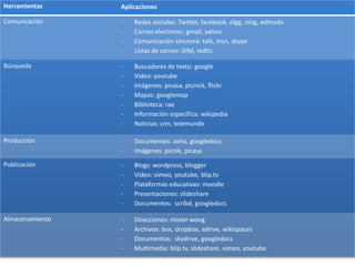 El documento describe las herramientas Web 2.0, que son la segunda generación de comunidades y servicios en la web como sitios de redes sociales y wikis que facilitan la colaboración y el compartir contenido entre usuarios. Estas aplicaciones utilizan la web como plataforma, efectos de red impulsados por participación de usuarios, innovación por desarrolladores independientes, y modelos de negocio pequeños que comparten servicios y contenido a través de plataformas. El documento luego lista ejemplos de herramientas de comunicación, búsqu