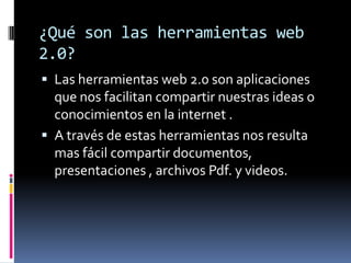 Las herramientas web 2.0 son aplicaciones que facilitan compartir ideas y conocimientos en Internet de manera más fácil a través de documentos, presentaciones, archivos PDF y videos. Estas herramientas tienen la ventaja de permitir compartir conocimientos y facilitar la comunicación, pero la desventaja es que solo hacen accesible el conocimiento compartido a personas con acceso a dichas herramientas.