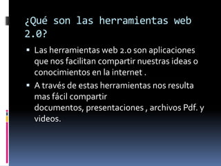 Las herramientas web 2.0 son aplicaciones que facilitan compartir ideas y conocimientos en Internet de manera más fácil a través de documentos, presentaciones, archivos PDF y videos. Estas herramientas tienen la ventaja de permitir compartir conocimientos y facilitar la comunicación, pero la desventaja es que solo hacen accesible el conocimiento compartido a personas con acceso a estas herramientas.