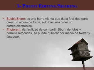 El documento describe diferentes herramientas web 2.0 como BubbleShare y Photorem para compartir y editar fotos; Facebook y My Space como redes sociales; Google Talk Video y Skype para videollamadas; Bloglines e iGoogle como portales personales; Wikia y MediaWiki como wikis; y 99chats y chat de Facebook como herramientas de chat.
