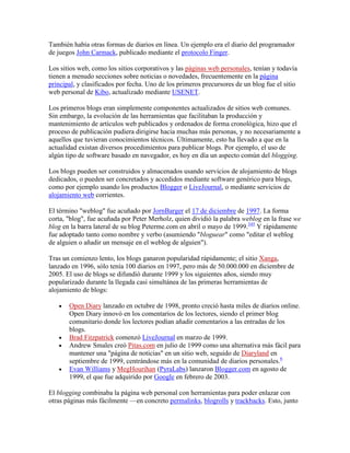 El documento describe los orígenes y evolución de los blogs. Comenzaron como diarios personales en línea en los años 90. En la década de 2000 ganaron popularidad como herramienta para compartir opiniones y noticias. Hoy en día, los blogs son una parte importante de Internet y son utilizados por individuos, empresas y comunidades para compartir todo tipo de contenido.