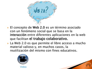 El documento presenta el concepto de web 2.0, destacando su papel en facilitar la interacción y el trabajo colaborativo a través de diversas herramientas en línea, especialmente en el ámbito educativo. Se mencionan diferentes tipos de herramientas, como redes sociales, wikis, gestores de contenido y plataformas educativas, que se utilizan para mejorar la enseñanza y el aprendizaje. Además, se incluyen enlaces a recursos y aplicaciones relacionadas que apoyan la creación de materiales didácticos y la gestión de la información académica.