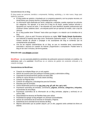 El documento describe varias herramientas web 2.0 como Blogger, WordPress, Dropbox, TWiki, Mindmeister y Wikispaces. Blogger y WordPress son plataformas para crear blogs. Dropbox permite sincronizar archivos en la nube. TWiki y Wikispaces son wikis que permiten la edición colaborativa de contenido. Mindmeister permite crear mapas mentales de forma colaborativa. Todas estas herramientas facilitan la publicación, edición y compartición de contenido de forma interactiva y colaborativa.