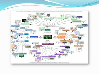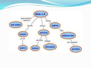 El documento explica la evolución de la web desde sus inicios hasta la actualidad. Define la Web 1.0 como la versión más básica con solo texto, la Web 2.0 como la que permite interacción y contenido generado por usuarios, y debate la existencia de la Web 3.0 con tecnologías semánticas a pequeña escala. También describe herramientas comunes de la Web 2.0 en el aula como blogs, foros y aulas virtuales donde profesores comparten contenido y estudiantes interactúan.