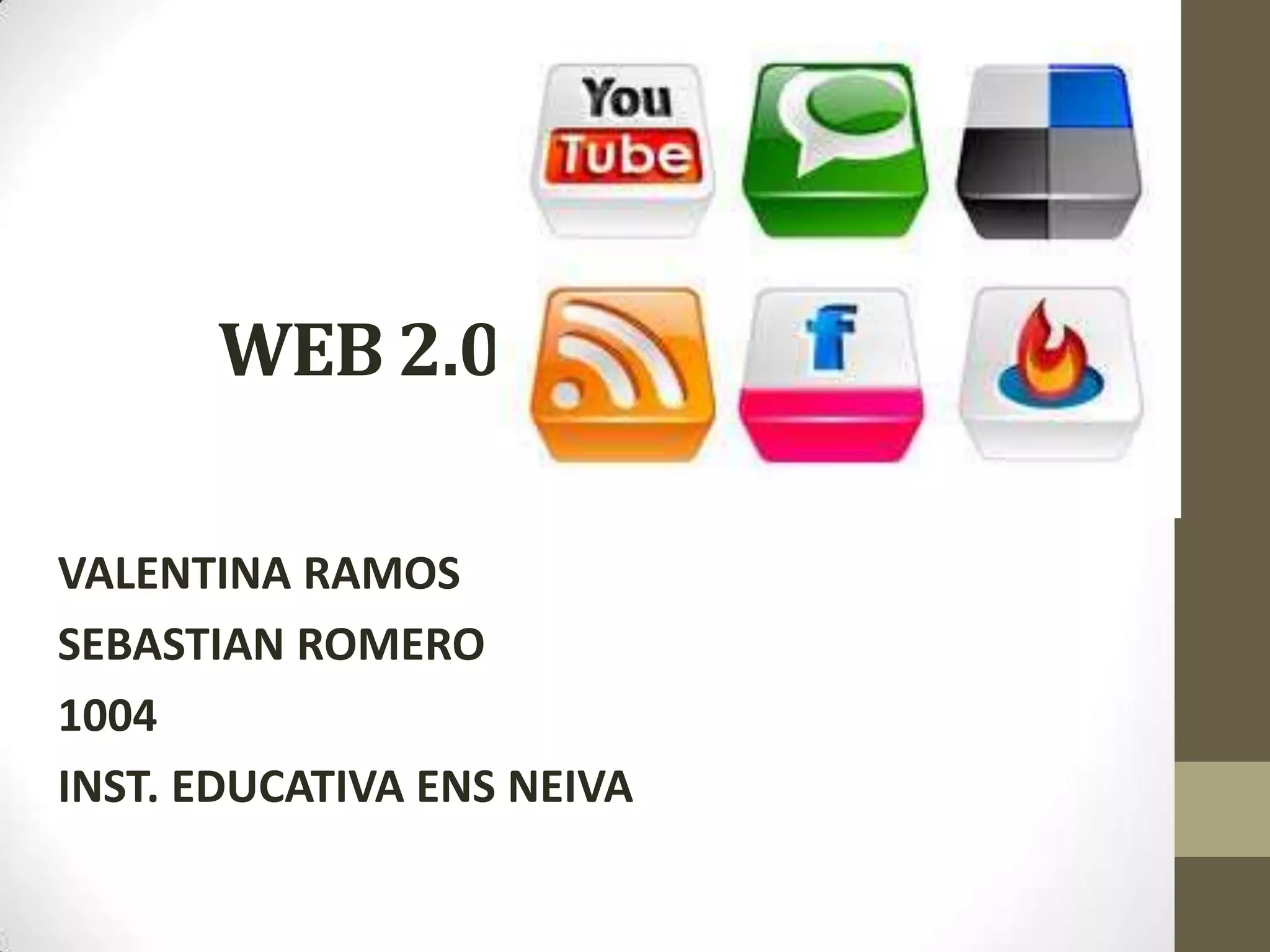 El documento habla sobre la Web 2.0 y sus características principales. Explica que la Web 2.0 se refiere a la transición hacia aplicaciones en línea centradas en el usuario y la colaboración. Luego describe algunos de los canales más populares de la Web 2.0 como wikis, podcasts, Facebook, Twitter y YouTube, resumiendo brevemente sus funciones y características. Finalmente, incluye algunos videos, opiniones e imágenes relacionadas con el tema.