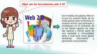Las herramientas web 2.0 permiten a los usuarios participar y contribuir al contenido de la red de forma activa, creando y formando parte de comunidades a nivel local y global para facilitar el intercambio de información y generar conocimiento. Los blogs, Slideshare, Wikis y Flickr son ejemplos de herramientas web 2.0 que permiten compartir contenido como artículos, presentaciones, páginas colaborativas y fotografías con fines educativos, comerciales o de difusión del conocimiento.