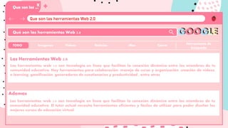 Las herramientas Web 2.0 son tecnologías en línea que facilitan la conexión dinámica y colaboración entre miembros de una comunidad educativa. Incluyen herramientas para colaboración, gestión de cursos, creación de videos, aprendizaje electrónico, gamificación, encuestas y productividad. Las herramientas Web 2.0 permiten a los usuarios interactuar y colaborar como creadores de contenido.