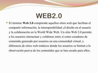 El documento describe diferentes herramientas de la Web 2.0 como agregadores, almacenamiento, audio y podcasts, blogs, buscadores, comunicación, cursos en línea, fotos, gráficos y diagramas, mapas, marcadores sociales, páginas de inicio y presentaciones. Define cada herramienta y explica cómo pueden usarse para fines educativos como enriquecer contenidos, compartir información, comunicarse y gestionar cursos en línea.