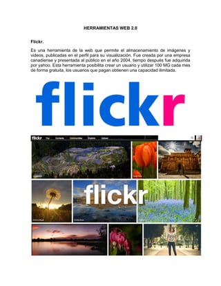 Este documento describe varias herramientas web 2.0 como Flickr, Animoto, Slideshare, Prezi, Mindomo y Powtoon que permiten almacenar y compartir imágenes, crear videos y presentaciones, y hacer mapas conceptuales. También describe herramientas ofimáticas como procesadores de texto, hojas de cálculo y suites ofimáticas, así como servicios en la nube como Dropbox, Hotmail, Google Drive y herramientas de captura de pantalla como Camtasia Studio. Finalmente, menciona a YouTube como un sitio para compartir videos.