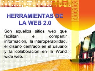 Las herramientas web 2.0 facilitan el compartir información, la interoperabilidad y la colaboración en la web, destacando instrumentos como blogs, redes sociales y wikis. Estas plataformas han transformado la manera en que los usuarios interactúan, permitiendo la creación de contenido colectivo y la comunicación en tiempo real. La adopción de estas tecnologías ha tenido un impacto significativo en la organización social y en el ámbito educativo.
