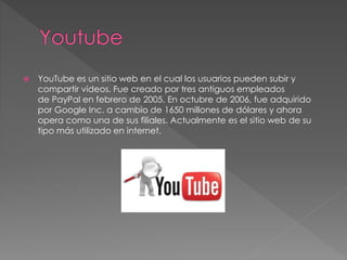 YouTube es un sitio web creado en 2005 para que usuarios suban y compartan videos. Fue adquirido por Google en 2006 y es actualmente el sitio más utilizado para este propósito. Scribd permite a usuarios subir y compartir documentos de texto en varios formatos de manera gratuita, mientras que SlideShare sirve para presentaciones en PowerPoint y otros formatos de diapositivas. Flickr se enfoca en almacenar y compartir imágenes entre usuarios.