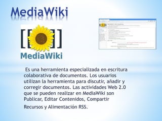 MediaWiki permite la edición colaborativa de documentos en línea, donde los usuarios pueden publicar, editar y corregir contenidos de forma conjunta. Mindmeister permite a los usuarios crear y compartir mapas mentales de forma colaborativa en línea. People Aggregator es una red social personalizada que permite publicar contenidos, crear grupos y relaciones entre usuarios.