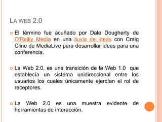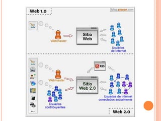 El documento habla sobre las herramientas web 2.0 para el aprendizaje colaborativo. Explica que la web 2.0 permite la interacción entre usuarios a diferencia de la web 1.0 que era unidireccional. Algunas herramientas discutidas incluyen wikis, que permiten editar páginas colaborativamente; Facebook, que puede usarse para crear grupos de trabajo cerrados; y blogs, que permiten publicar contenido de forma periódica. El documento también describe cómo los docentes pueden usar estas herramientas para facilit