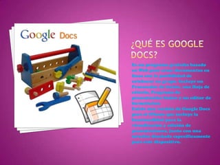 Google Docs es una aplicación web gratuita de Google que permite crear documentos, hojas de cálculo, presentaciones y formularios en línea de forma colaborativa. Los archivos se almacenan en los servidores de Google y se pueden exportar a formatos estándar. Google Docs también permite la edición móvil de documentos. SlideShare permite compartir presentaciones PowerPoint u Open Office en línea de forma gratuita. Un proyecto colaborativo es un trabajo en grupo con el fin de beneficiar a otros; sus fortalezas incluyen el trabajo bien real