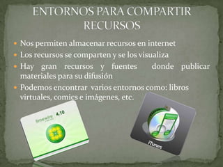 Este documento describe varios entornos para compartir recursos en línea como libros virtuales, documentos, cómics, imágenes, podcasts, presentaciones, videos y marcadores sociales. Estos entornos nos permiten almacenar y compartir recursos como fotos, música y videos para ilustrar trabajos y encontrar información para documentarnos sobre diferentes temas. Los estudiantes pueden crear y compartir materiales audiovisuales y multimedia usando estos entornos.
