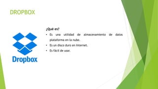 El documento describe varias herramientas web 2.0 como Dropbox, Prezi, Fotos Narradas, YouTube y Geogebra. Dropbox es una plataforma en la nube para almacenamiento de datos que permite compartir archivos. Prezi es una herramienta para crear presentaciones en línea de forma animada y didáctica. Fotos Narradas permite crear videos integrando imágenes, texto y audio. YouTube es un sitio para publicar y compartir videos de hasta 10 minutos. Geogebra es un software para realizar construcciones y resoluciones matemáticas de manera gráfica