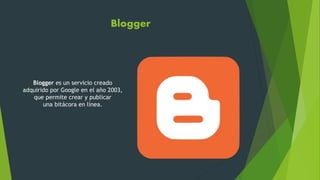 Este documento describe diferentes herramientas web 2.0 como Blogger para crear bitácoras, redes sociales que conectan personas, YouTube para compartir videos, SlideShare para presentaciones, Google Docs para documentos colaborativos, Wikispaces para wikis, Flickr para fotos, Delicious para marcadores web, LinkedIn para negocios y Hi5 como red social.