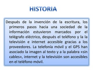 Este documento describe la historia y tipos de tecnologías de la información. Explica que después de la invención de la escritura, el telégrafo, el teléfono y la televisión marcaron los primeros pasos hacia una sociedad de la información. Luego describe las redes como telefonía fija, banda ancha, telefonía móvil y televisión, así como servicios como correo electrónico, banca en línea, motores de búsqueda y audio y educación. Finalmente, discute las herramientas de la Web 2.0
