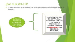 El documento describe las herramientas de la Web 2.0 y su uso en educación. Explica que la Web 2.0 se centra en la participación de los usuarios y permite la colaboración y producción de contenido. Luego describe varias herramientas como blogs, wikis, podcasts, redes sociales, Slideshare y su aplicación en la educación como repositorios de contenido, espacios de comunicación y colaboración, y para compartir archivos y videos. El documento concluye que el reto es desarrollar en los estudiantes las competencias para