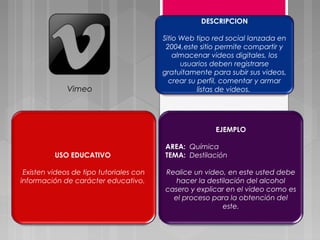 El documento describe diferentes herramientas digitales como Vimeo, SlideShare, Mindomo, Issuu, GoAnimate, WordPress y Skype y cómo pueden usarse con fines educativos, por ejemplo para compartir videos tutoriales, presentaciones, mapas mentales, ensayos, animaciones y blogs educativos o dar clases en línea a través de videoconferencias. Para cada herramienta se provee un ejemplo de tema y área del conocimiento en el que podría aplicarse.