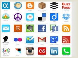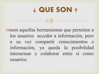 El documento presenta una explicación sobre las herramientas de la Web 2.0, que permiten el acceso, compartición e interacción de información entre usuarios. Se describen varios tipos de plataformas, como blogs, wikis, redes sociales y entornos para compartir recursos, resaltando sus características y funciones. También se mencionan ejemplos específicos de servicios en línea para videos, fotos, documentos y noticias.